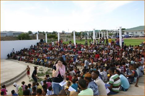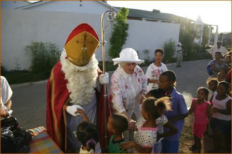 Gestern war einer der größten Tage im Center, der Nikolaus sollte kommen. Wir haben uns in den Schulen umgehört, mit wie viel Kindern wir rechnen können. Wir sind auf 1200 gekommen! Also mussten wir für jedes Kind ein Päckchen packen. Ich habe noch nie soviel Süßigkeiten gesehen. In der letzten Woche haben wir die 1200 Päckchen mit Hilfe unserer zuverlässigsten Kinder gepackt. Am Sonntag wurden 1200 Hot Dogs vorbereitet, damit die Kinder auch ein Essen erhalten. Die Kinder sind um 16.30 Uhr ins Center gelassen worden. Eltern sind verboten, weil es in der Vergangenheit Probleme mit den betrunkenen Müttern gegeben hat. Jedes Kind hat am Eingang ein Stück Kuchen und ein Wassereis bekommen. Der Kuchen wurde von Freiwilligen aus dem Ort gebacken. Das Eis wurde zu einem sehr günstigen Preis verkauft. Um 17 Uhr begann das Programm. Zuerst hat Father David mit allen Kindern Weihnachtslieder gesungen. Anschließend wurde von Father David und seiner Theatergruppe das Weihnachtstheater/Krippenspiel aufgeführt. Eine Band aus dem Ort hat anschließend den Kindern nochmal eingeheizt und alle 1200 Kinder tanzten. Die Band kommt aus dem Township und hat alte Traditionslieder mit Hip Hop kombiniert und jedes Kind konnte mitsingen < der Wahnsinn >! Leider war ich schon von der Bildfläche verschwunden, weil mein großer Auftritt nun folgen sollte. Ich musste das Gewand des alten Father Christmas, St. Nikolaus anlegen. Das einzige Groß-fahrzeug der Feuerwehr Oudtshoorn wurde bereit gestellt, um den St. Nikolaus ins Center zu fahren. Ich stand auf dem Dach des Fahrzeuges und habe allen Kindern zu gewunken. Einige Kinder haben mich an meinen Schuhen erkannt, die dicken Schuhe wollte ich hier in der Hitze nicht tragen und leichte Schuhe waren keine da, so dass ich meine eigenen Schuhe anziehen musste. Bei der Einfahrt mit dem Feuerwehrwagen staunten die Kinder nicht schlecht, weil sie mit einer Eselskutsche rechneten wie in jedem Jahr. Als das Signalhorn des Trucks ertönte erschreckten sich viele Kinder. Die Überraschung - da war ja noch der Nikolaus drauf. Eine Runde durchs Center und dann kletterte der Nikolaus vom Dach. Am Ausgang bekam jedes Kind ein Päckchen mit Süßigkeiten und einen Handschlag vom Nikolaus persönlich. Weiter hinter dem Ausgang bekam jedes Kind noch ein Hot Dog. Glücklich und mit einem riesigen Lächeln im Gesicht sind dann alle Kinder nach Hause gegangen, wenn ein Zuhause vorhanden ist. Sie müssen wieder nach ein paar Stunden Frohsinn in ihrem „nicht immer einfachen Alltag“ zurück.